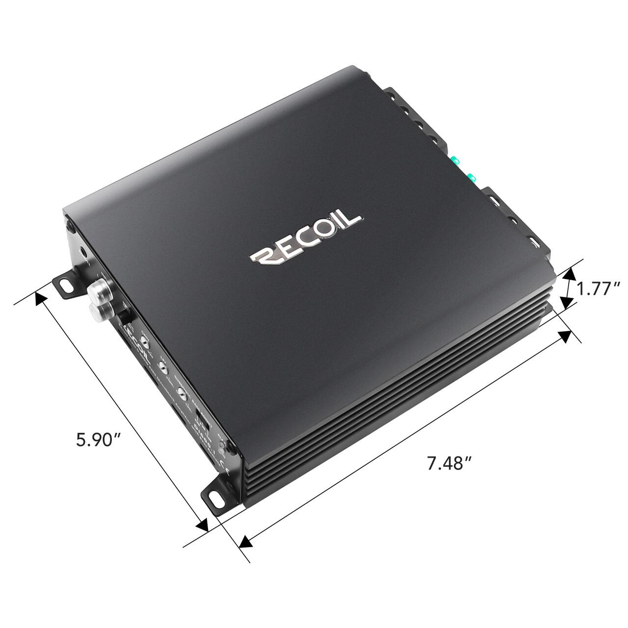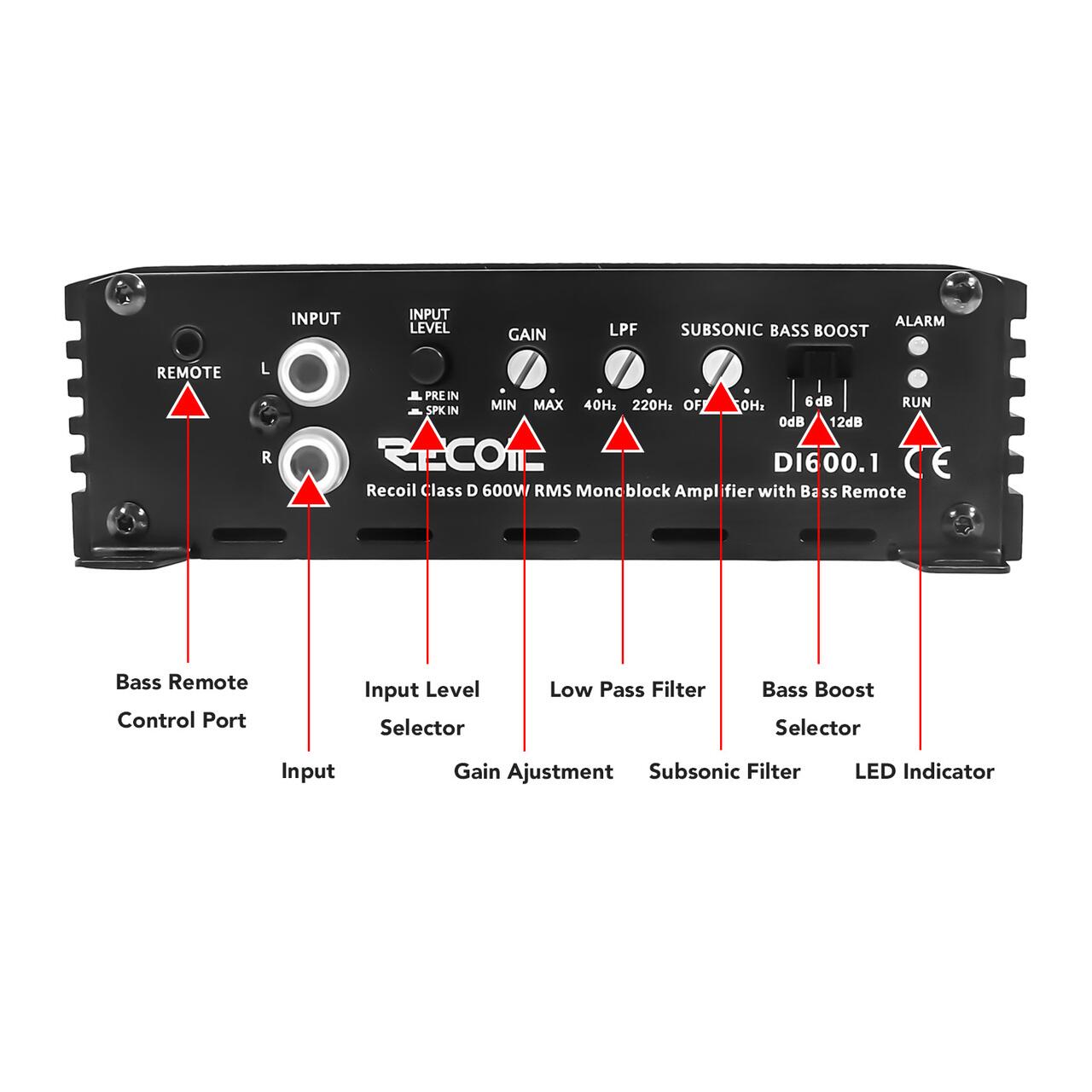 - Amplificatoarele mono Recoil sunt dotate cu o telecomandă pentru bas. Folosește-o pentru a-ți personaliza basul din mers, doar rotind din buton.