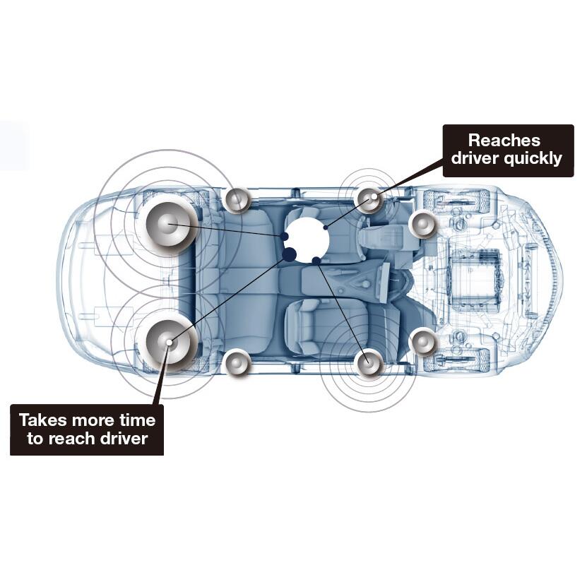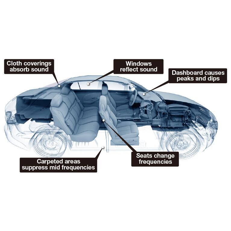 - Interiorul masinii este plin cu materiale care creaza distorsiuni si degradeaza sunetul. Ferestrele amplifica si reflecta sunetele inalte. Scaunele si bordul acopera anumite frecvente. Mochetele si tapiteria absorb sunetele medii. Aceste probleme sunt prea complexe pentru a fi rezolvate de un simplu egalizator. In plus , datorita amplasarii diferite a difuzoarelor fata de ascultator, astfel incat scena sunetului este nebalansata si asimetrica.