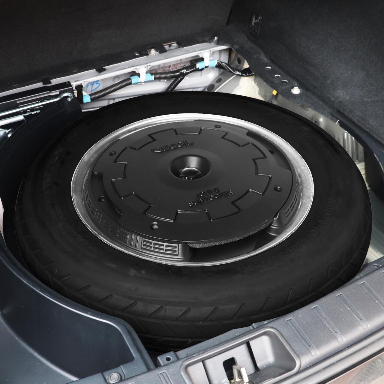 - Subwooferul pasiv Recoil de 12” pentru roata de rezervă, se introduce în roata de rezervă a vehiculului. Datorită funcției de eliberare rapidă, subwoofer-ul poate fi îndepărtat cu ușurință atunci când aveți nevoie să accesați roata.