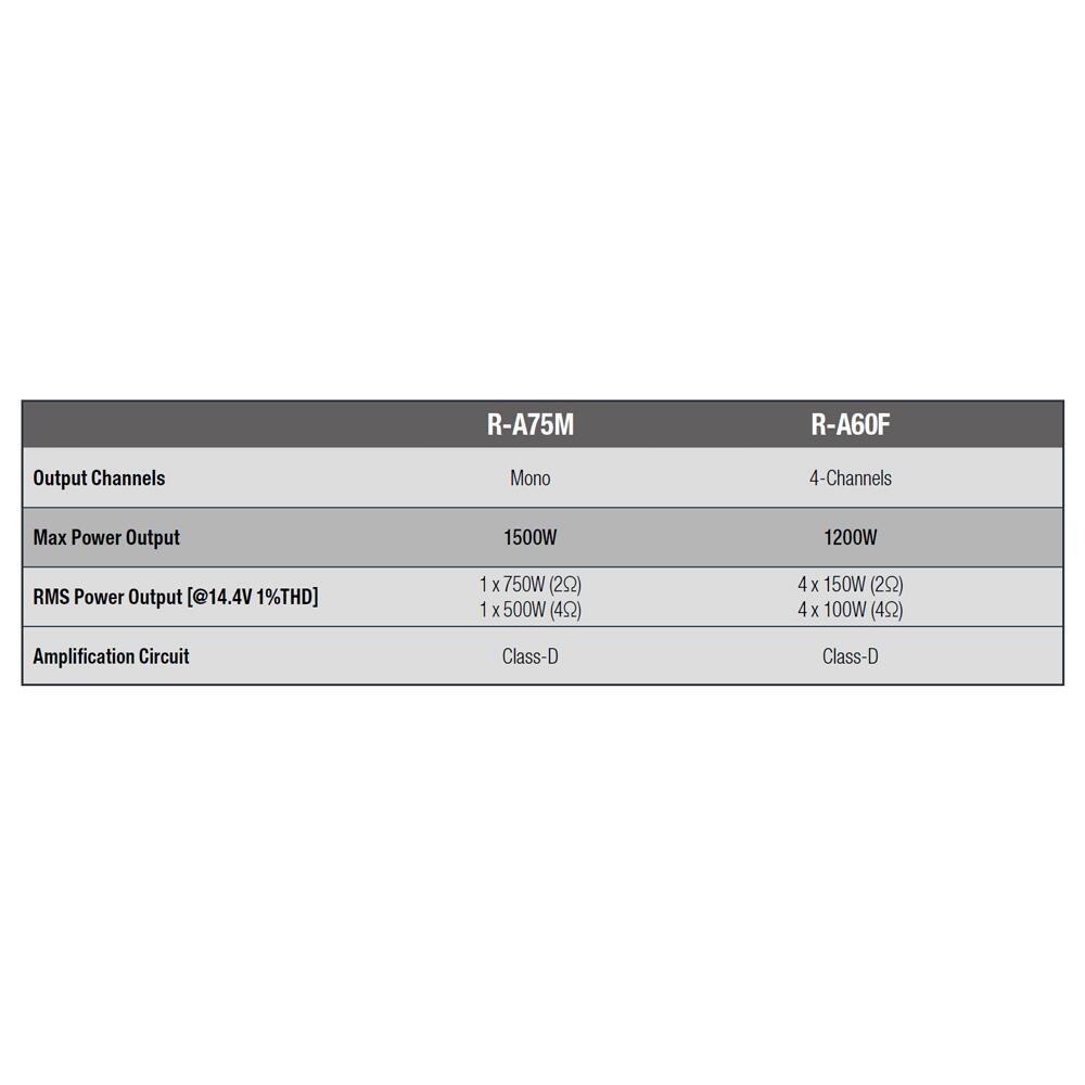 - Compact și puternic: noul amplificator digital permite o putere de ieșire ridicată, păstrând în același timp o amprentă mică. R-A75M măsoară doar 274 mm lățime x 223 mm lungime pentru o instalare ușoară în aproape orice vehicul.